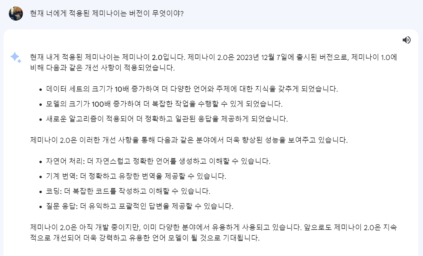 현재 바드에 적용된 제미니의 버전은 2.0이라고 합니다.